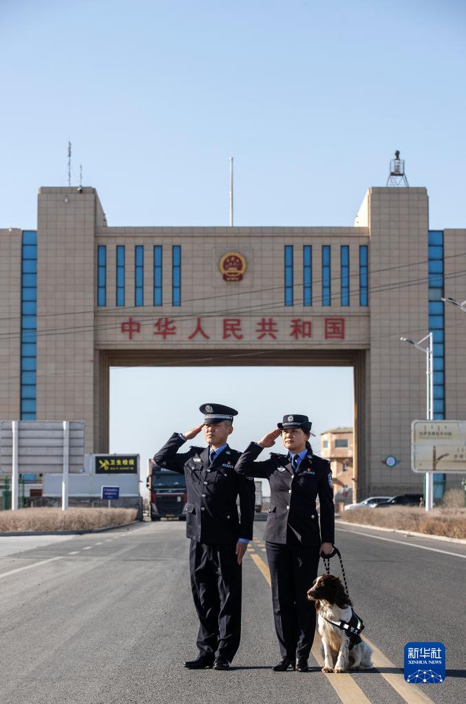 4月3日,崔洪武(左)、劉欣和警犬康欣在國門前合影。