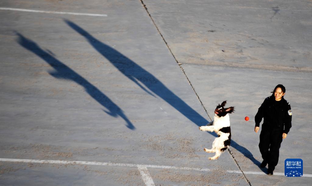 4月3日,下班后,劉欣和警犬康欣一起游戲。新華社記者 費茂華 攝