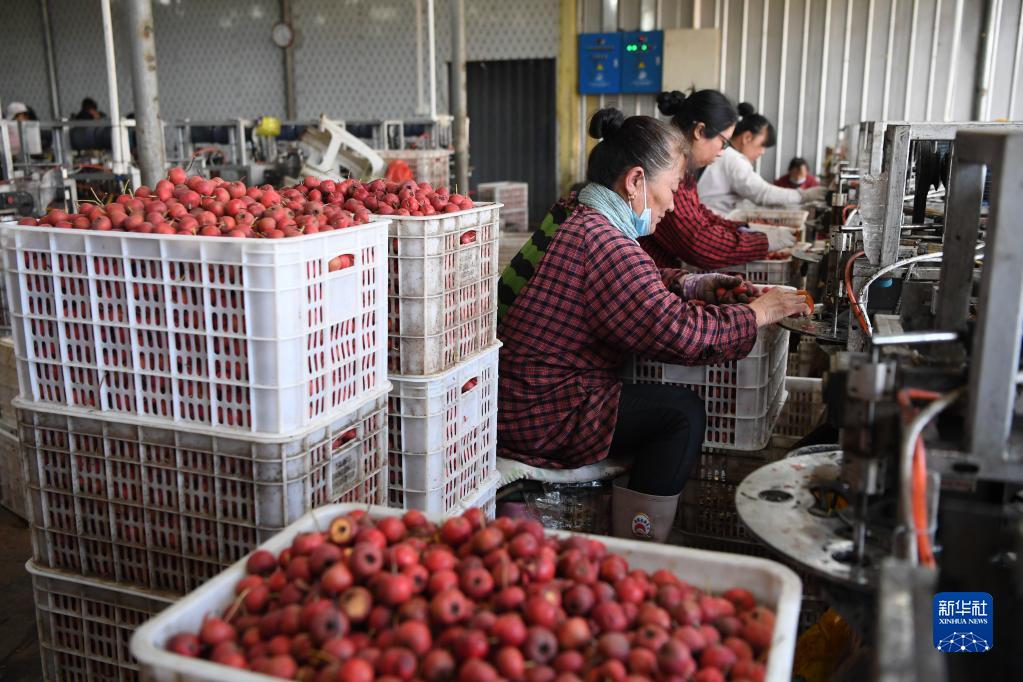 4月6日,在天津市薊州區下營鎮野森家庭農場,工人對山楂進行初加工。