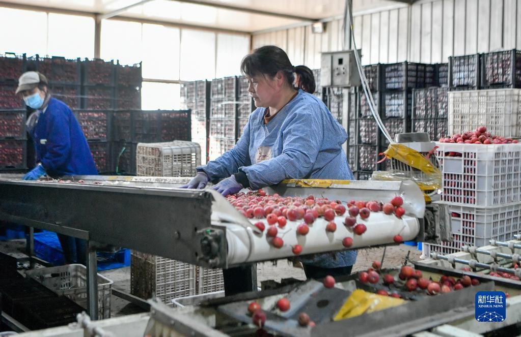 4月6日,在天津市薊州區(qū)下營(yíng)鎮(zhèn)野森家庭農(nóng)場(chǎng),工人對(duì)山楂進(jìn)行初篩。