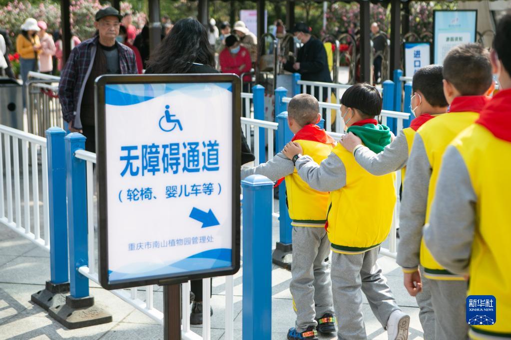 3月14日,重慶市特殊教育中心的視力障礙學(xué)生從無障礙通道進(jìn)入重慶市南山植物園。