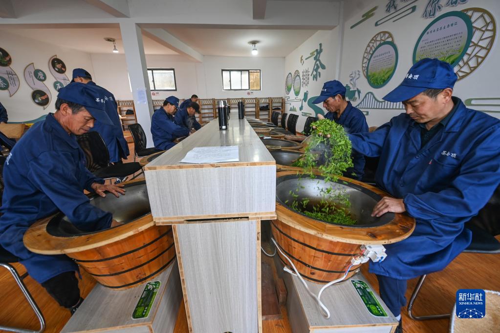 4月7日,工作人員在安頂村的共富工坊內炒制安頂云霧茶。