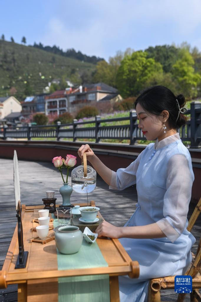 4月7日,工作人員在安頂村共富工坊外進行茶藝表演。