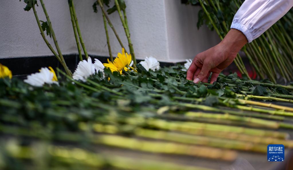4月7日,參加活動(dòng)的志愿者在現(xiàn)場(chǎng)獻(xiàn)花。