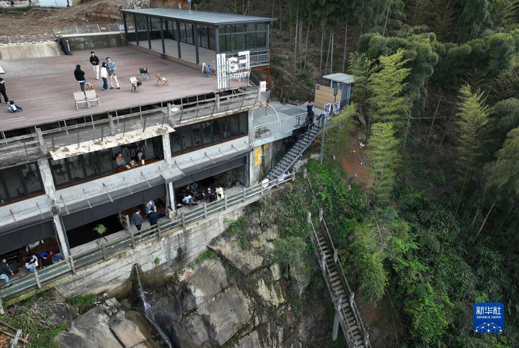 這是安吉縣報福鎮百丈塢村的瀑布咖啡館(4月7日攝,無人機照片)。