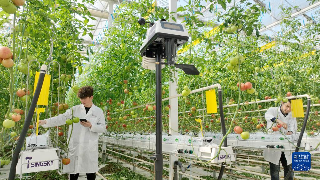 4月7日,在浙江省湖州市德清縣阜溪街道龍勝村水木“未來農場”,技術人員監測番茄水肥灌溉量數據(無人機照片)。