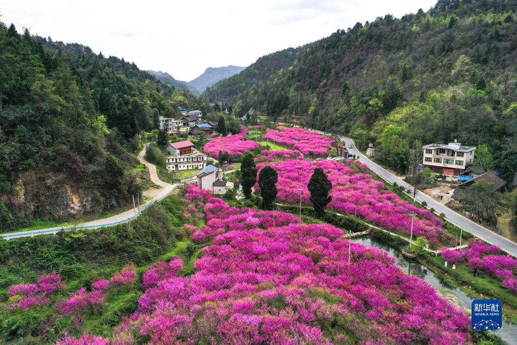 4月7日在貴州省岑鞏縣天馬鎮玉門洞景區拍攝的紫荊花園(無人機照片)。