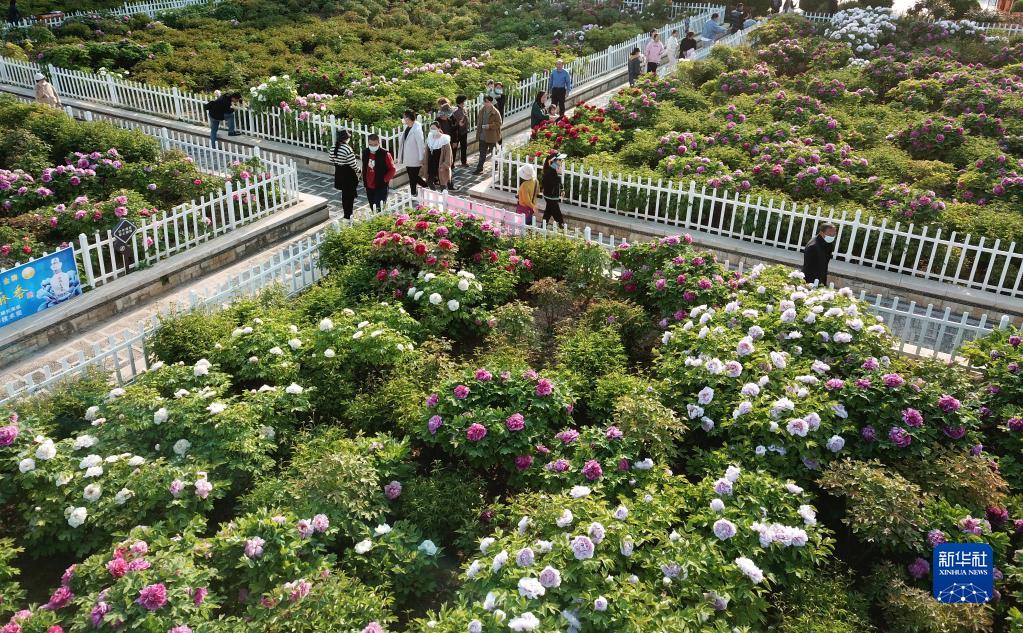 4月7日,在山東省菏澤市牡丹區(qū)的曹州牡丹園,游客在觀賞牡丹花(無(wú)人機(jī)照片)。
