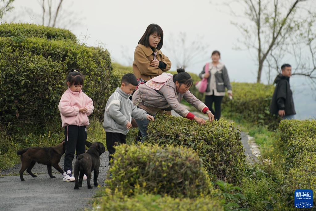 4月5日,在漢中市南鄭區牟家壩鎮的茶園,游客跟隨茶農學習采茶。