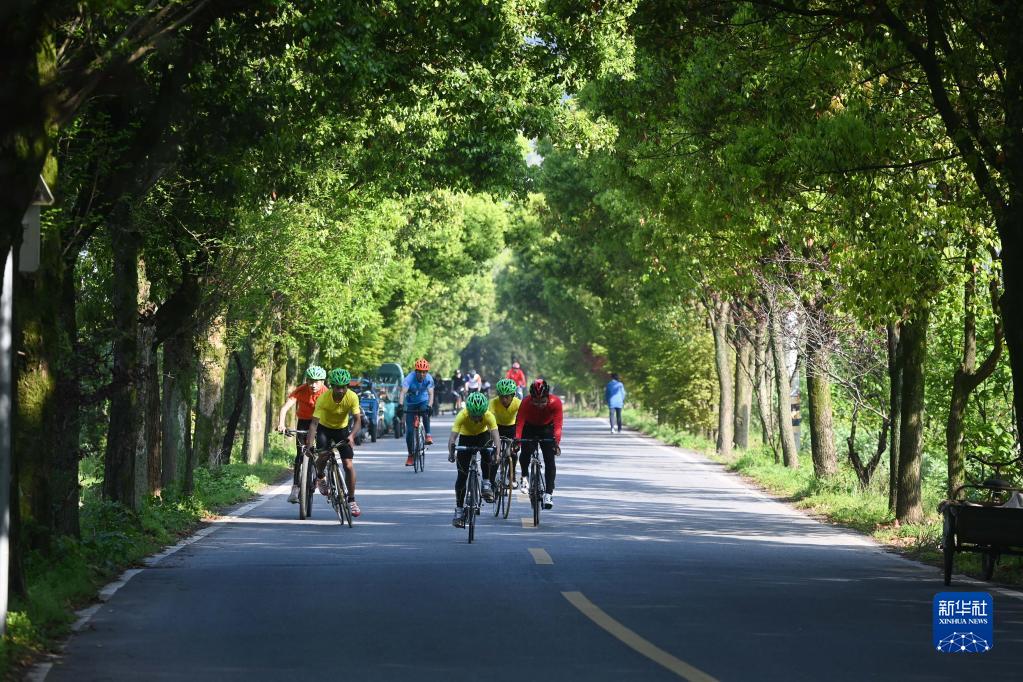 4月8日,騎行愛好者在浙江省諸暨市趙家鎮香榧國家森林公園參加健身騎行活動。