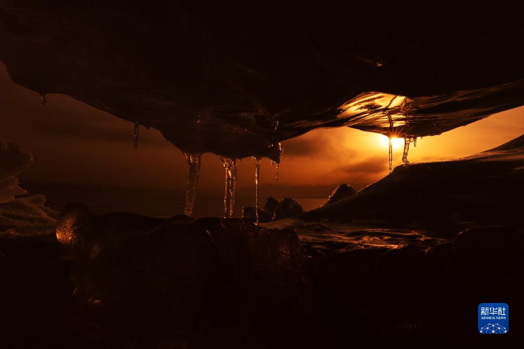 4月6日,賽里木湖畔的冰推在夕陽下散發(fā)著光芒。