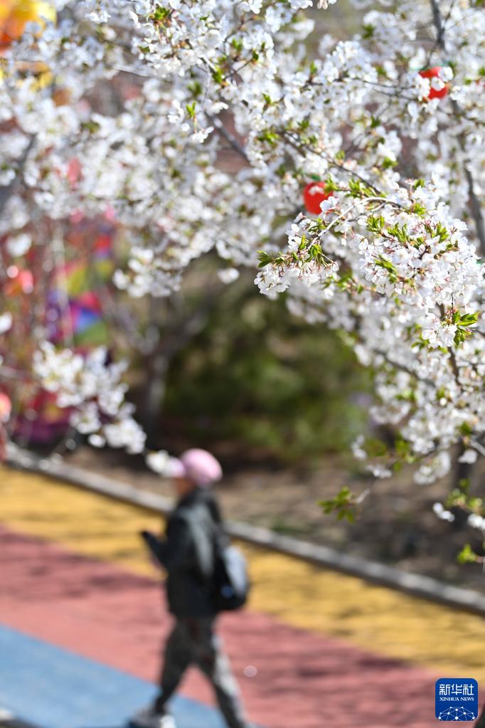 4月8日,游客在玉泉山城郊森林公園觀賞櫻花。