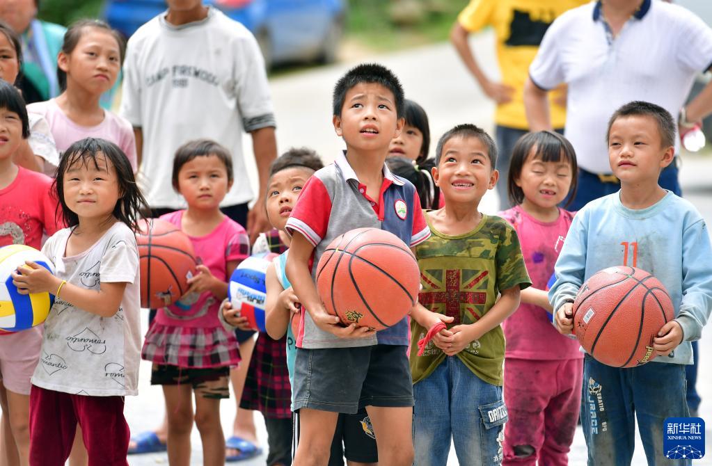 2019年7月27日,桂黔烏英苗寨的小學生練習投籃。