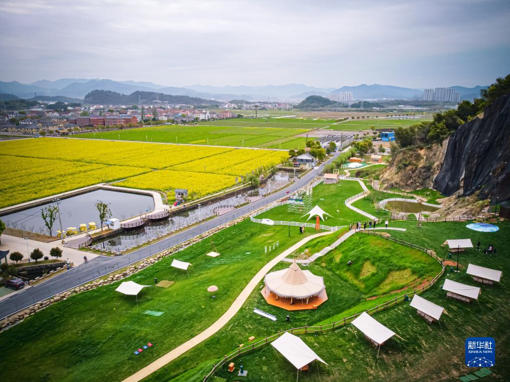 這是浙江省諸暨市楓橋鎮杜黃新村用廢棄礦山改造的露營旅游地(3月29日攝,無人機照片)。