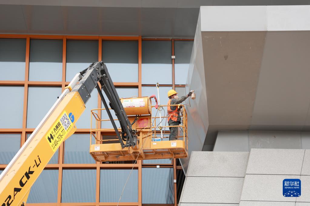 4月9日,工人對外立面面板進行噴漆。