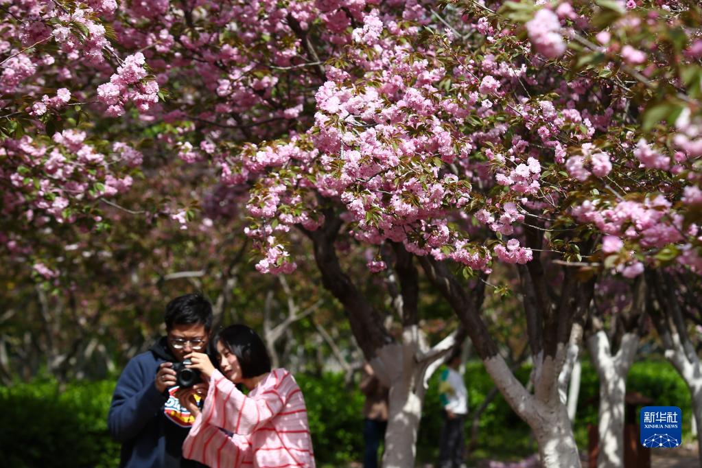 4月9日,游客在山東省濟南市森林公園賞花拍照。
