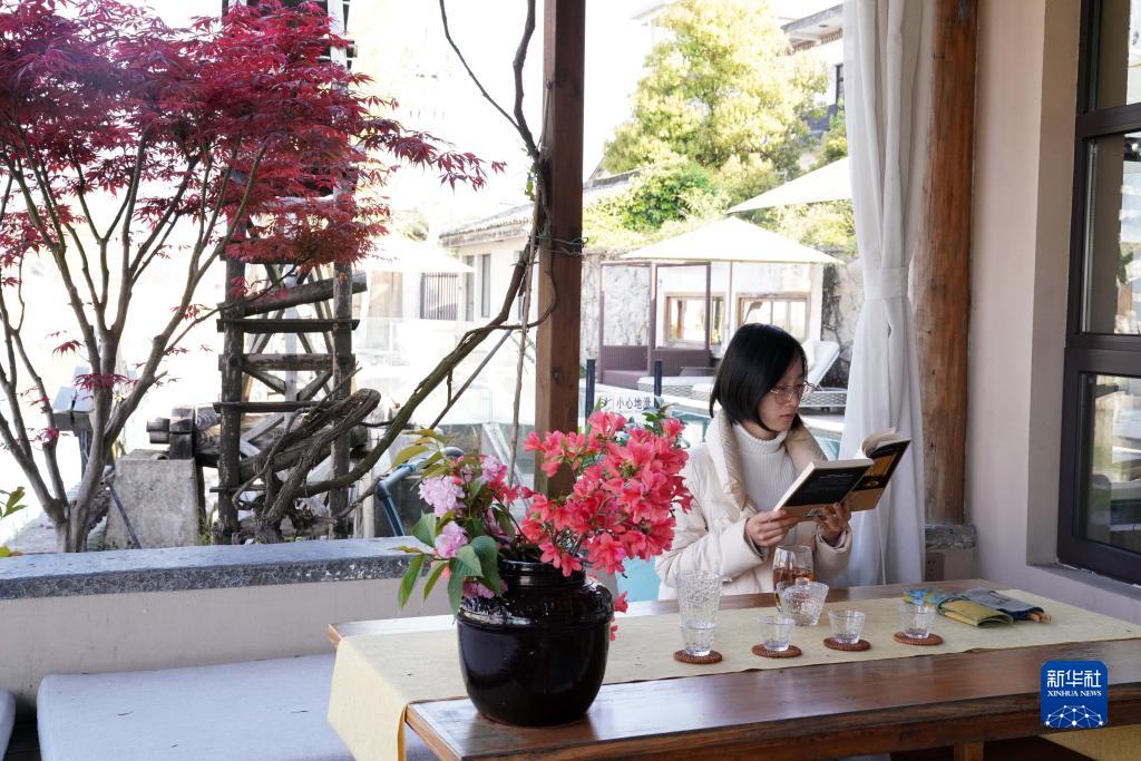 4月10日,一位客人在黟縣碧陽(yáng)鎮(zhèn)的山水間·黑多白少民宿讀書(shū)。