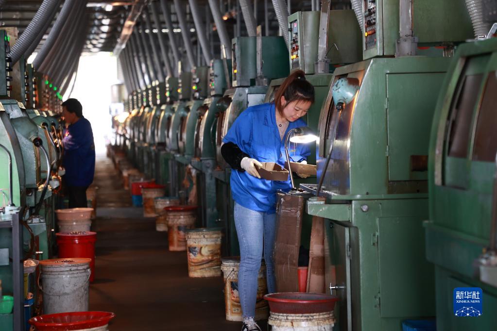 4月10日,搬遷群眾在獨(dú)山縣望城社區(qū)安置點(diǎn)附近的軸承產(chǎn)業(yè)園區(qū)內(nèi)生產(chǎn)軸承。