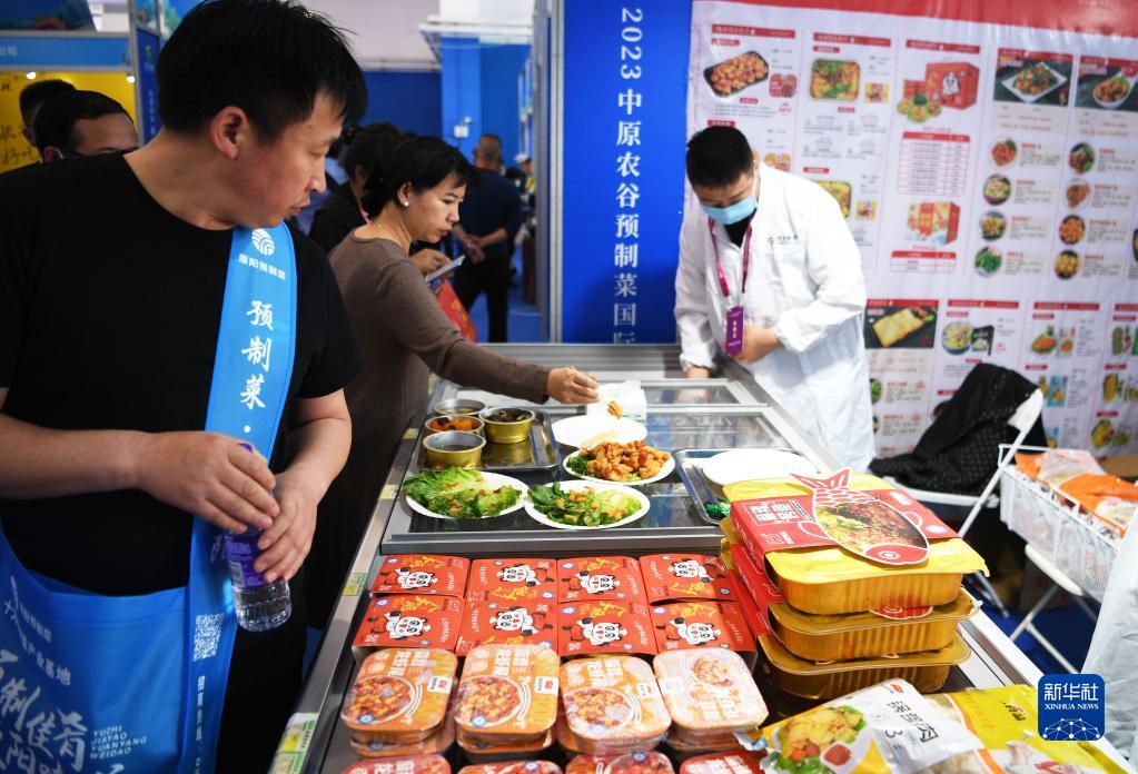 4月10日,參觀者在中原農谷預制菜國際博覽會上品嘗加工好的預制食品。