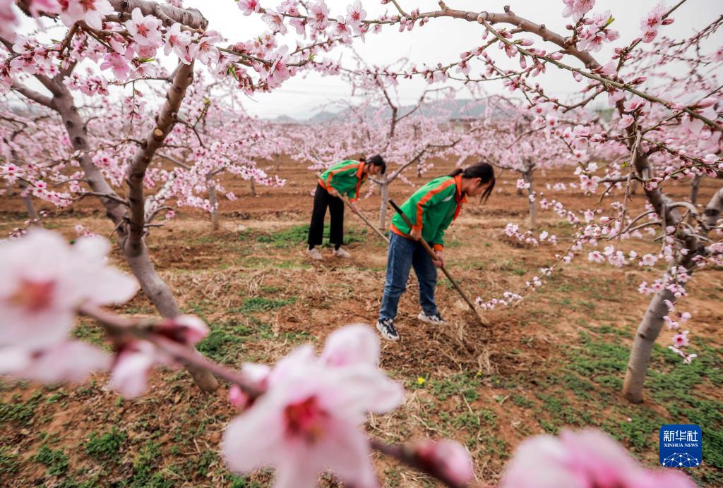 4月10日,河北省遵化市東舊寨鎮(zhèn)梁屯中心小學(xué)的學(xué)生在桃樹果園體驗鋤草勞動。