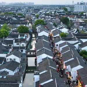 游客在江蘇蘇州山塘街休閑游玩(4月10日攝,無人機照片)。