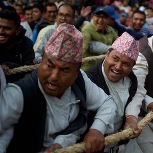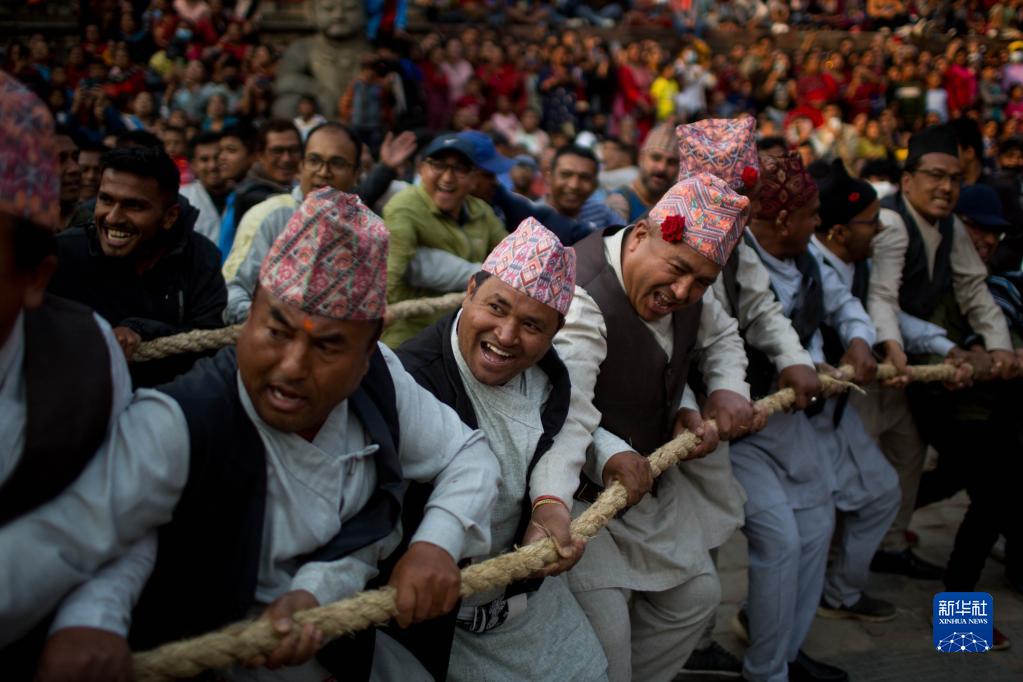 4月10日,在尼泊爾中部加德滿都谷地的巴克塔普爾,參加新年慶典的人們在傳統的慶?;顒由虾狭ν献Ь薮蟮纳裣駪疖?。