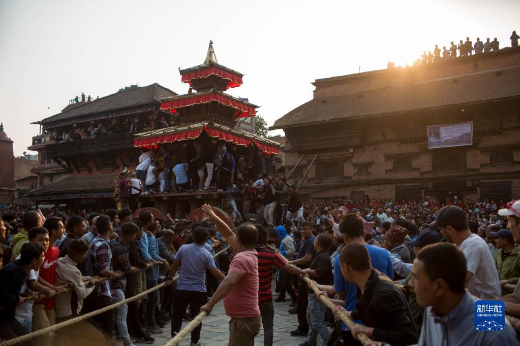 4月10日,在尼泊爾中部加德滿都谷地的巴克塔普爾,參加新年慶典的人們在傳統的慶祝活動上合力拖拽巨大的神像戰車。