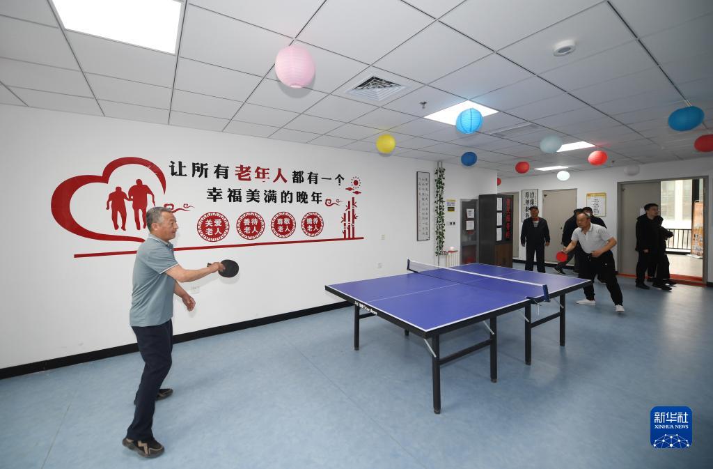 老年人在河北雄安新區(qū)容西第一養(yǎng)老驛站打乒乓球(4月10日攝)。