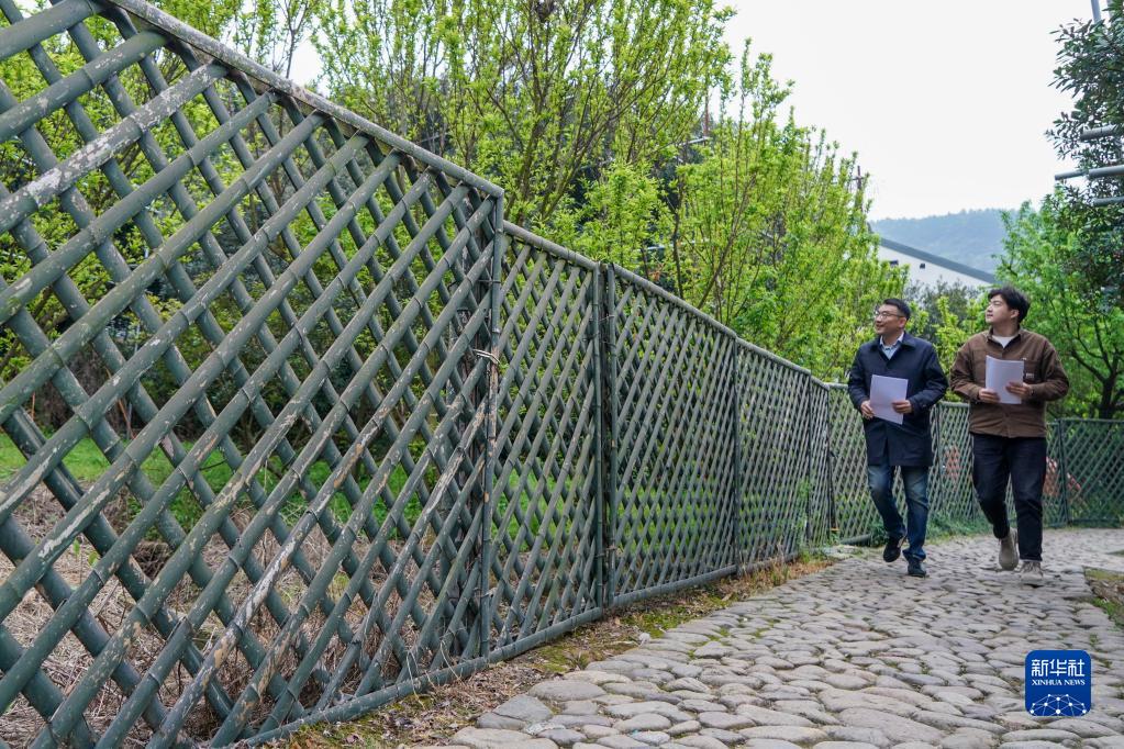 4月6日,彭銳(左)和助手在樹山村走訪調研。 新華社記者 李博 攝