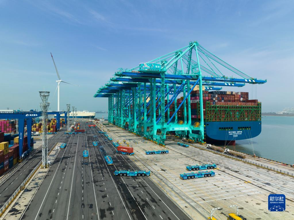 一艘貨輪靠泊在天津港“智慧零碳”碼頭進行裝卸作業(4月6日攝,無人機照片)。