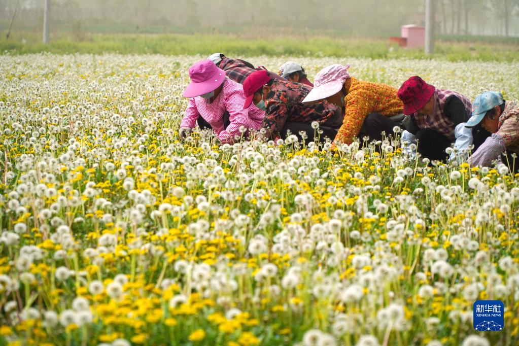 4月11日,在山東省單縣龍王廟鎮(zhèn),村民在蒲公英種植田收割蒲公英。