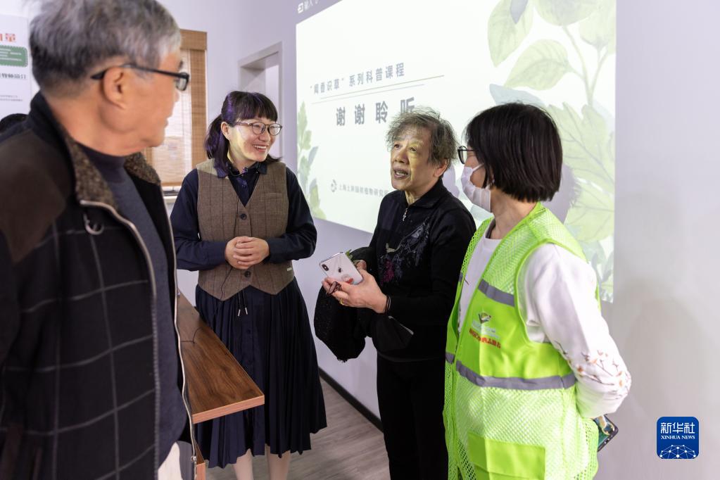 4月11日在閘北公園市民園藝中心拍攝的“園藝課堂”。市民在聽完公益講師申瑞雪(左二)的課后,分享平時種植遇到的問題并尋求指導。