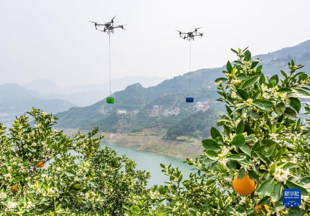 4月11日,秭歸縣郭家壩鎮擂鼓臺村村民在田間使用無人機轉運剛收獲的臍橙。
