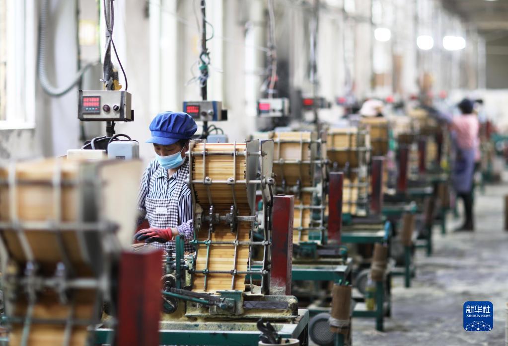 4月11日,在赤水市一家竹制品企業,工人在流水線上作業。