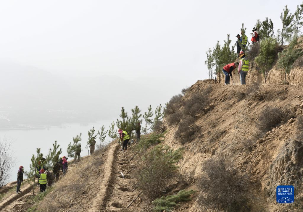 4月11日,人們在黃河劉家峽水庫岸邊植樹。