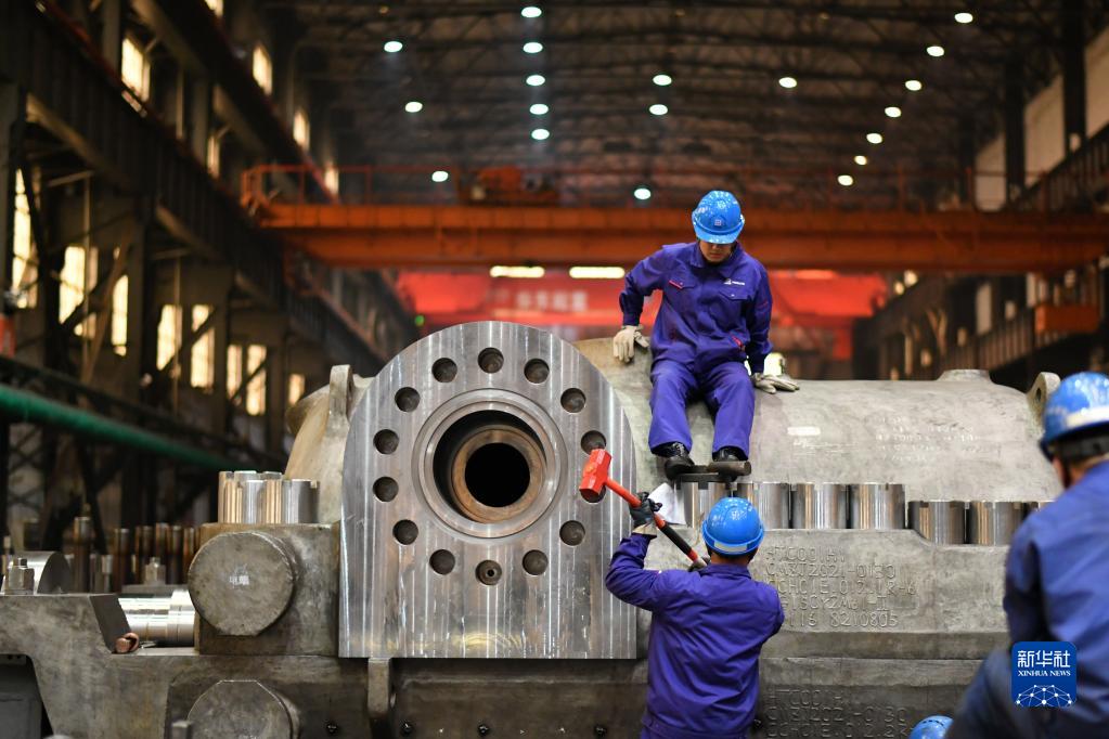 4月10日,工人在哈電集團哈爾濱汽輪機廠有限責任公司車間內生產作業。