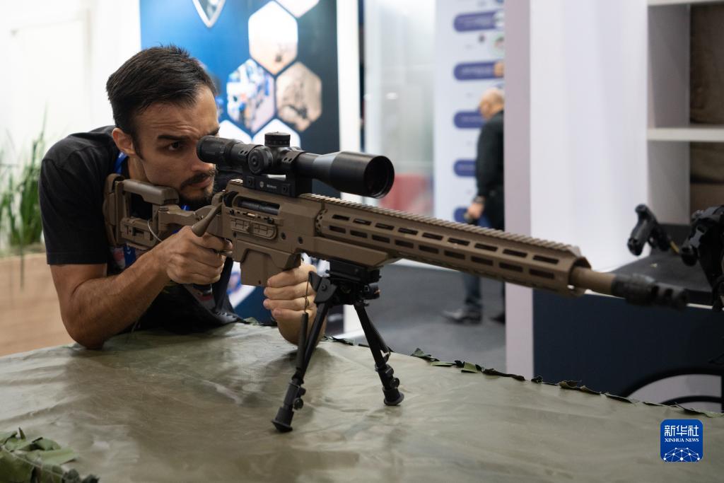 4月11日,在巴西里約熱內(nèi)盧,一名男子在巴西防務(wù)展上體驗一款步槍。