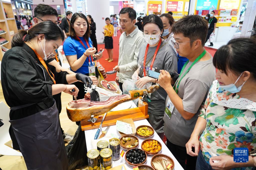 4月12日,參觀者在消博會現場品嘗產自西班牙的小吃。