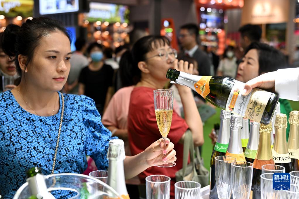 4月12日,參觀者在消博會上品嘗保留著香檳口感的無醇起泡果汁飲品。