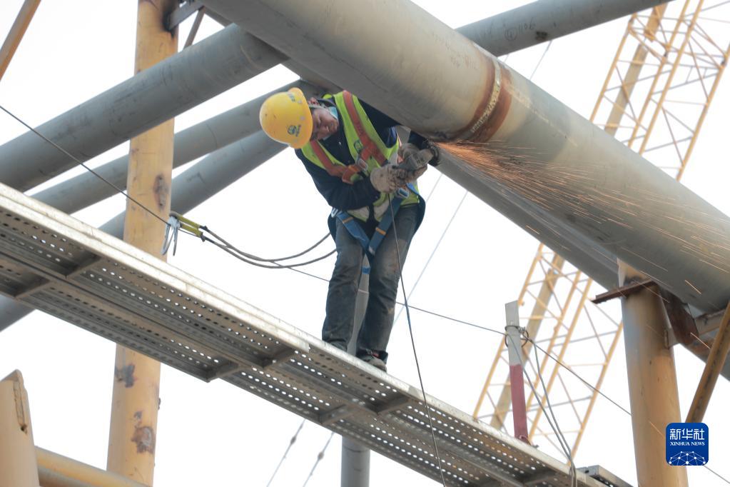 4月12日,工人在南昌東站站房工程現場施工。