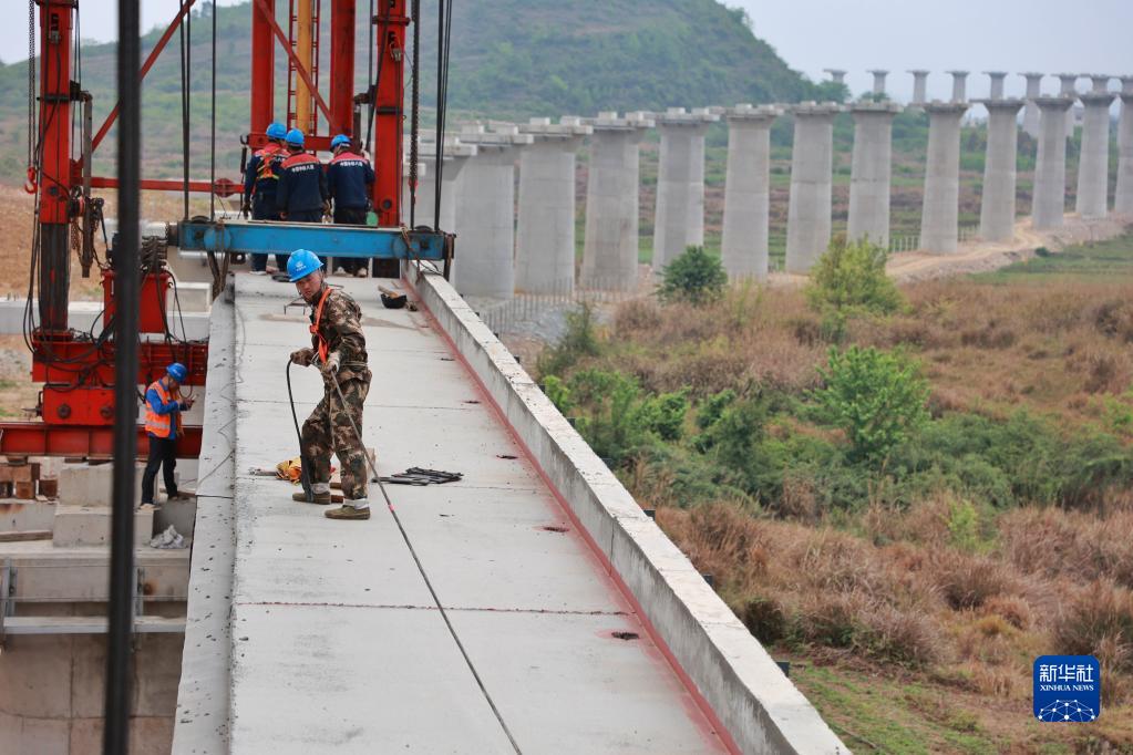 4月12日,工作人員在尖坡寨特大橋進行預制梁架設施工。