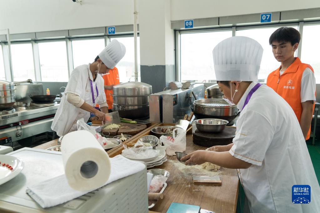 4月12日,在四川省綿陽市公共實(shí)訓(xùn)基地,參加中式面點(diǎn)項(xiàng)目的選手正在準(zhǔn)備食材。