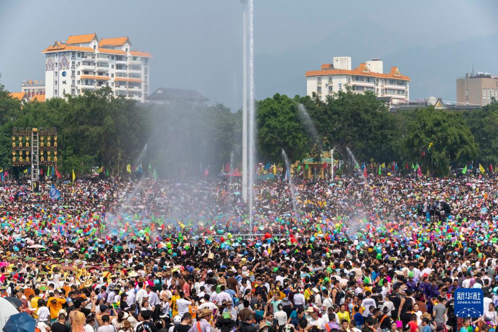 當日,云南省德宏傣族景頗族自治州芒市2023年潑水狂歡節開幕,人們相互潑灑代表幸福、吉祥的清水,表達著相互間的無限祝福。