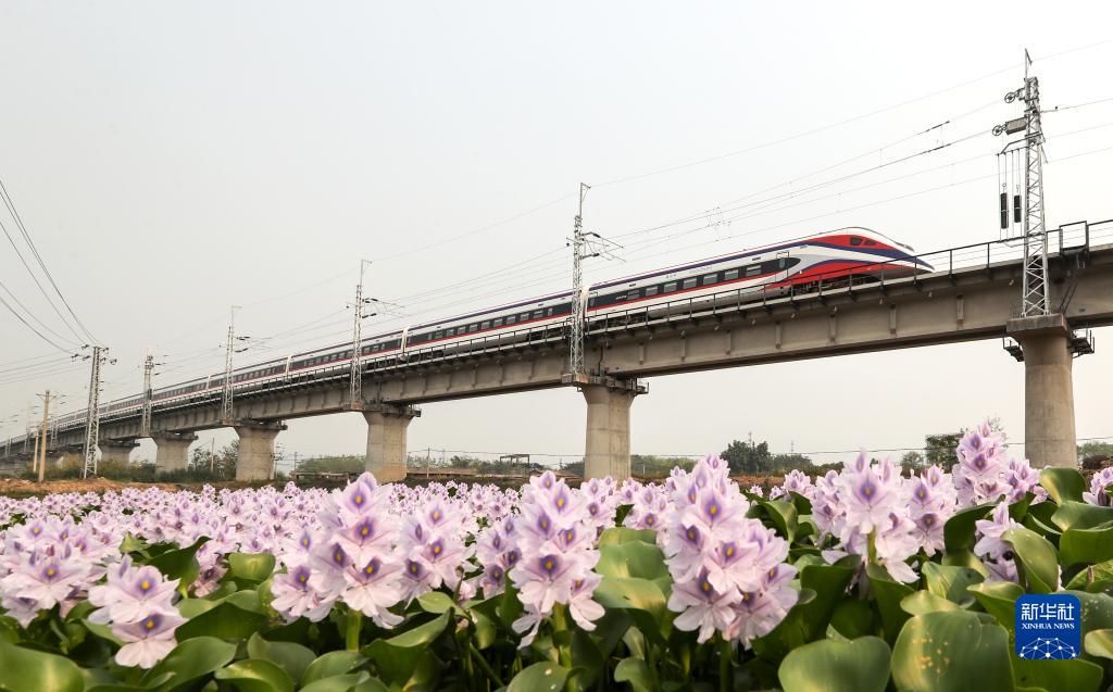 4月13日,從老撾萬象站駛出的D888次“瀾滄號(hào)”列車行駛在云南省西雙版納州境內(nèi)的中老鐵路橄欖壩特大橋上。