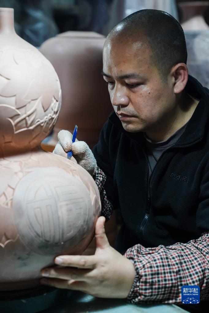 4月11日,在廣西欽州市,員工在坭興陶生產車間進行雕刻工作。