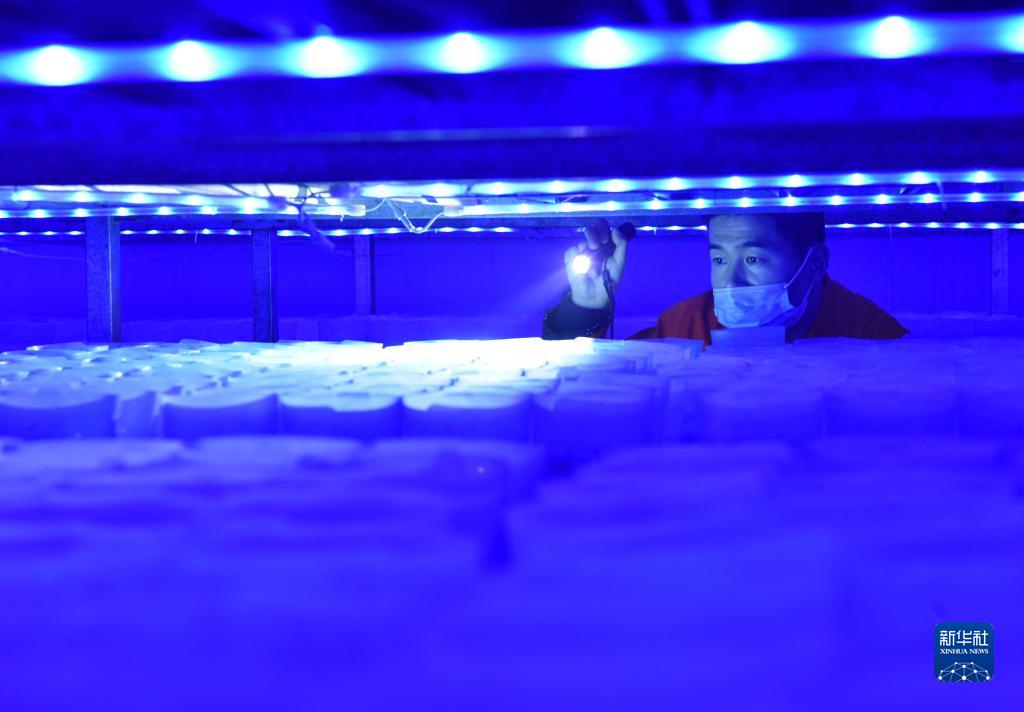4月13日,河北省臨西縣一家食用菌生產企業的員工在菌菇培育車間查看金針菇的生長情況。