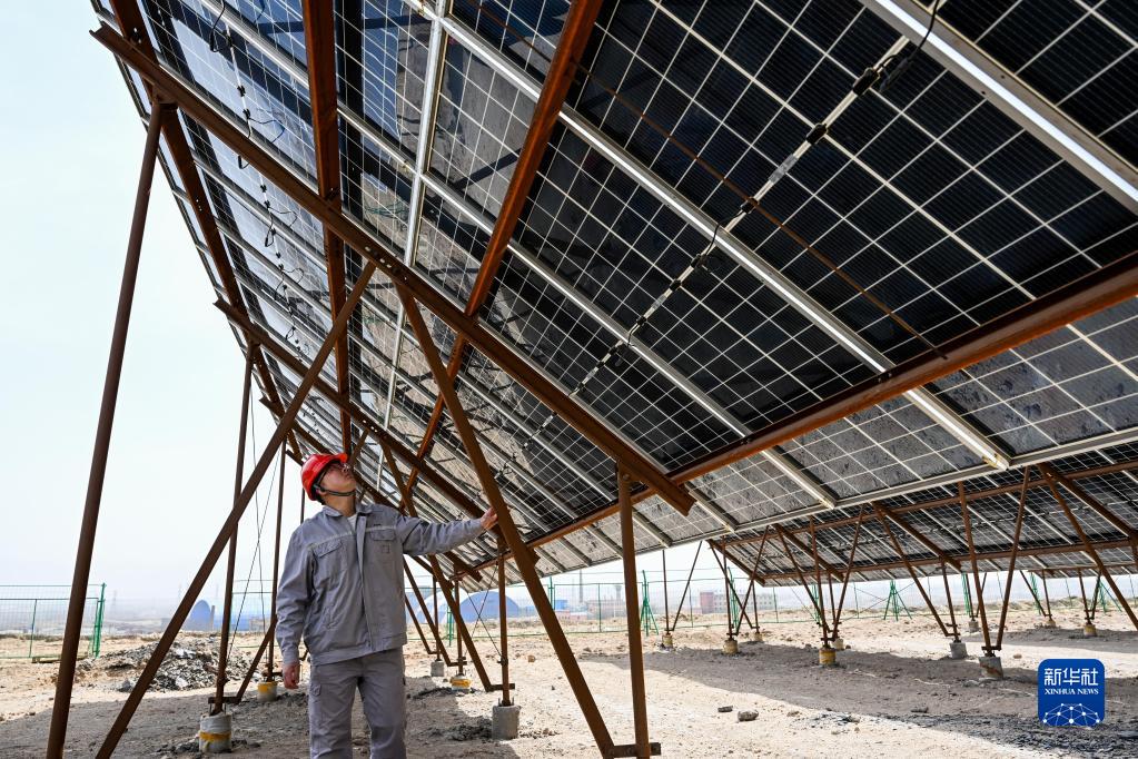 4月13日,在國家能源集團烏海能源公司黃白茨光儲電站,工人在巡檢光伏板。