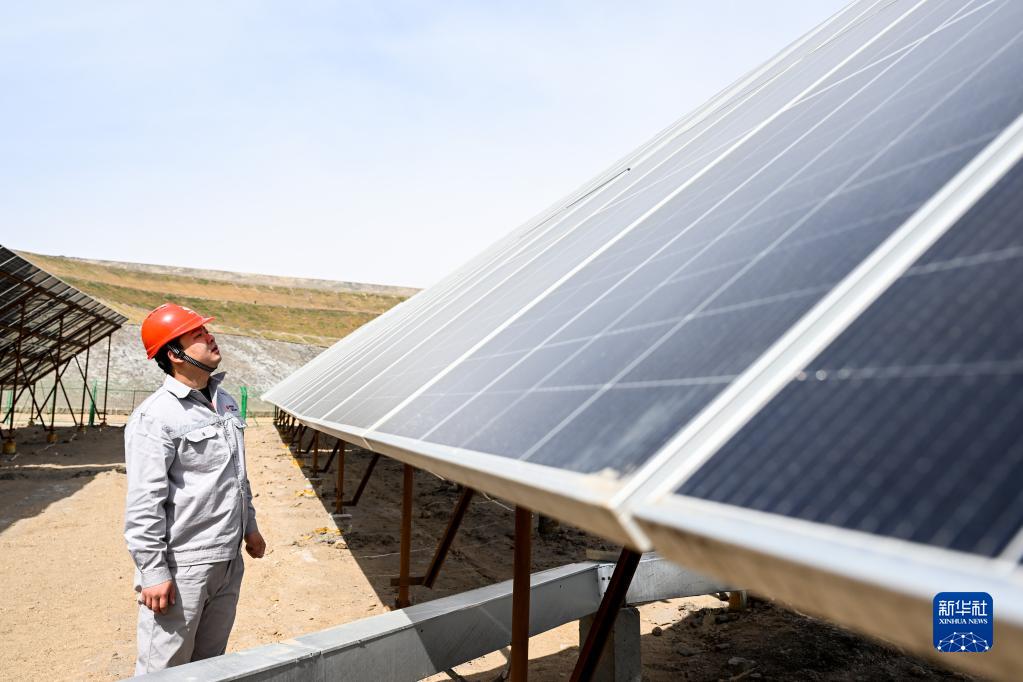4月13日,在國家能源集團烏海能源公司黃白茨光儲電站,工人在巡檢光伏板。