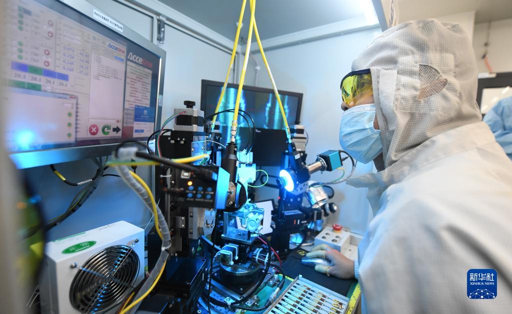 技術(shù)人員在光模塊生產(chǎn)線作業(yè)(4月11日攝)。