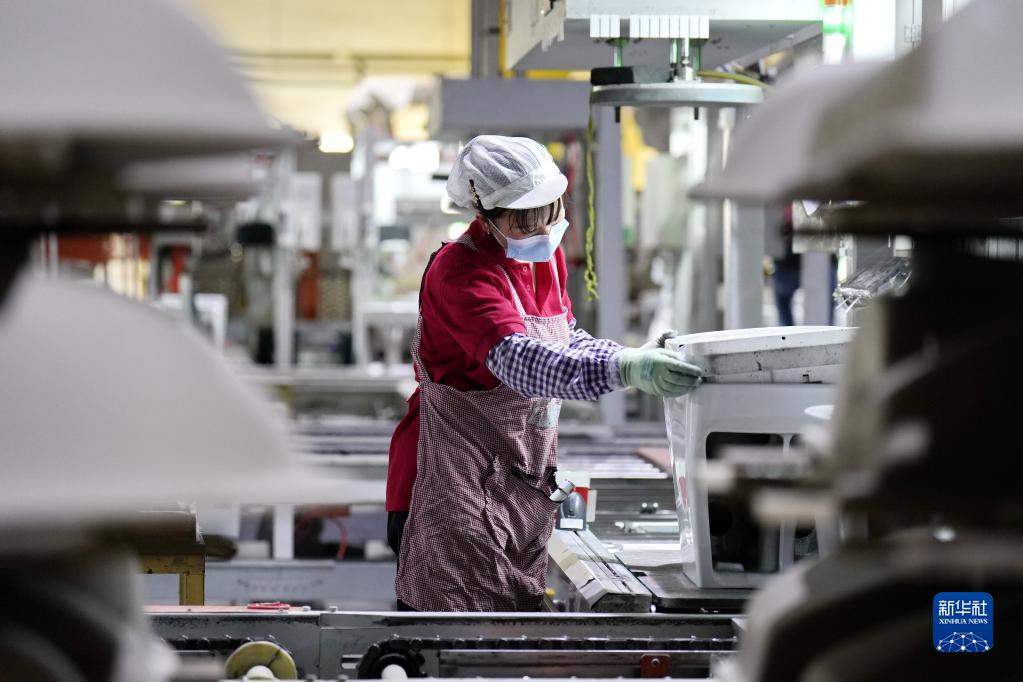 4月13日,唐山市一家衛浴出口企業的工人在生產線上工作。
